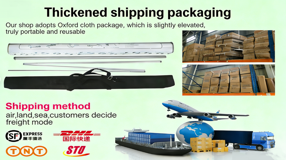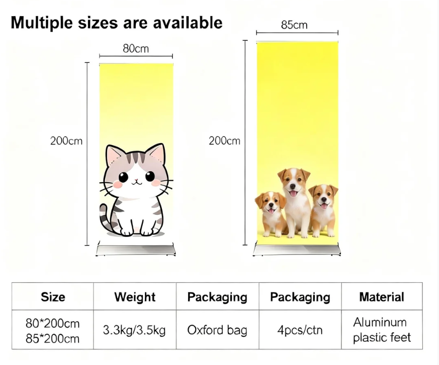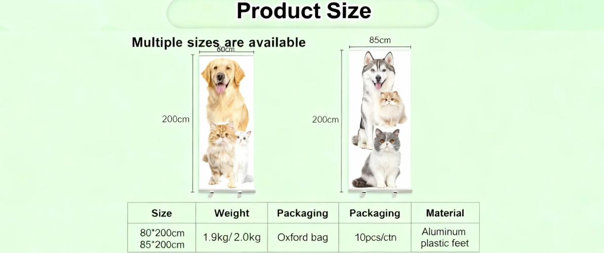 - Versatile Sizes & Customization for Targeted Branding:Available in two standard sizes (80X200cm/85X200cm) to suit different advertising needs, with custom size options available for bulk orders. Support logo, packaging, and graphic customization (MOQ 100 pieces) to align with your brand identity—ideal for personalized promotions or corporate events.The adjustable design allows you to fine-tune the display height, ensuring your message stands out at expos, conferences, beach events, or in-store promotions.